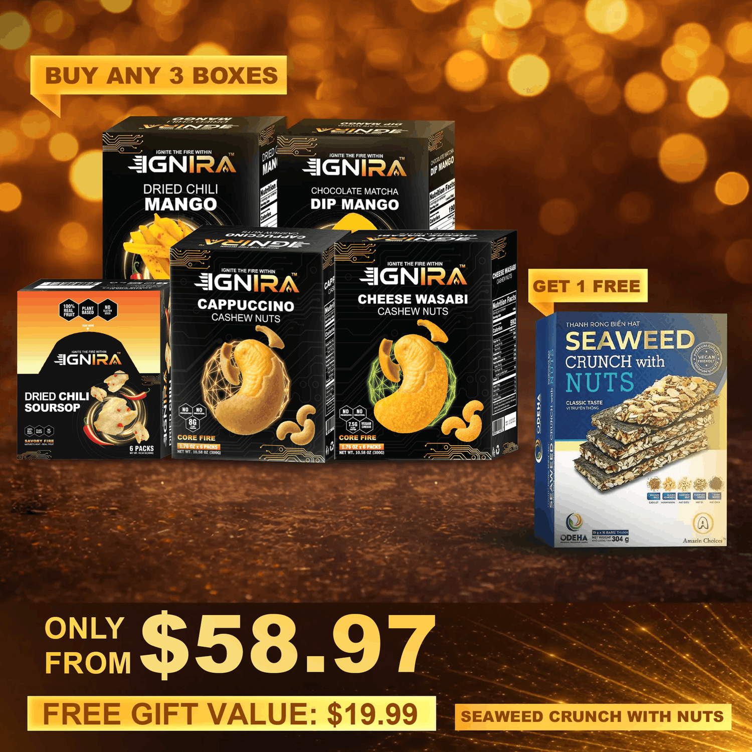 Buy Any 3 Boxes of Snacks Combo (Prices from $60) + Free Seaweed Crunch with Nuts Gift (10.7oz) – Only $59.97 (Free Gift Value: $19.99)